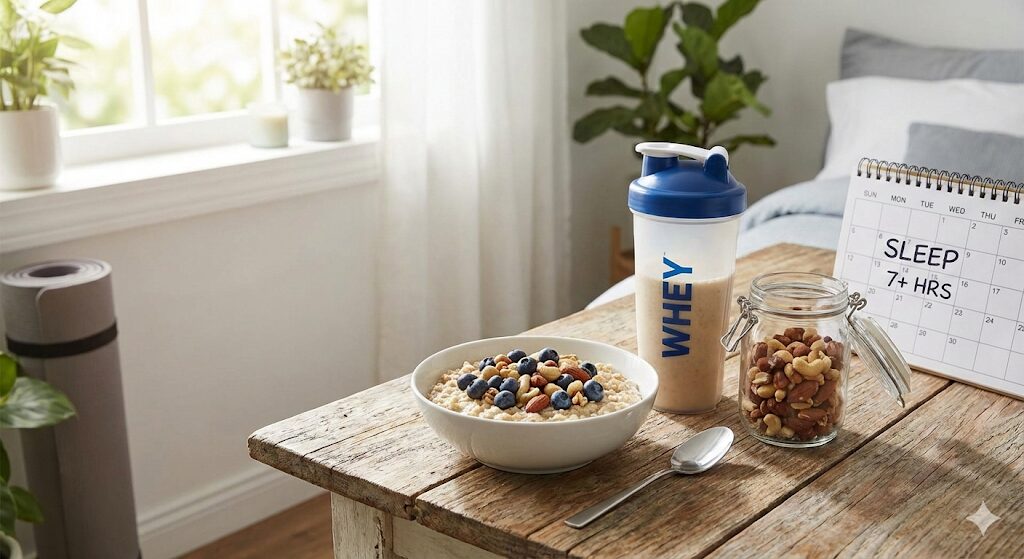 - 朝食: プロテイン(無添加)、オートミール、ブルーベリー、無縁ミックスナッツナッツ